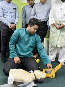 Selain ceramah, semua kakitangan juga menerima taklimat ringkas dan demonstrasi mengenai penggunaan alat AED (Automated External Defibrillator) oleh Encik Aiman Asyraf daripada Al Farabi Occupational Health Services (AFOHS).